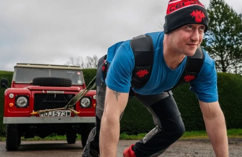 استهلّ الجندي البريطاني السابق، دارين هاردي، خطواته الأولى في تحدٍ استثنائي يهدف من خلاله إلى قطع مسافة 100 كيلومتر وهو يجر خلفه سيارة "لاند روفر" كلاسيكية تزن طناً ونصف الطن، مستخدماً حزاماً متصلاً بحبل صلب.