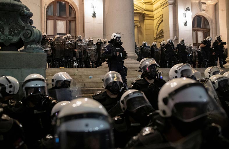 تظاهر آلاف الأشخاص لليوم الرابع على التوالي في عدد من المدن الصربية احتجاجا على طريقة معالجة الحكومة لأزمة كورونا. وذكر صحافيون من وكالة فرانس برس أن بعض المتظاهرين رشقوا رجال الشرطة بالحجارة أمام مبنى البرلمان في بلغراد، بينما أطلق آخرون أسهما نارية ورددوا شعارات قومية.