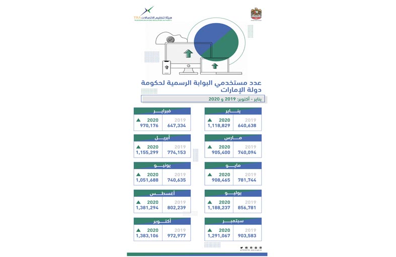 أعلنت الهيئة العامة لتنظيم قطاع الاتصالات عن تسجيل البوابة الرسمية لحكومة دولة الإمارات «U.AE” زيادة جديدة في عدد مستخدميها، الذين وصلوا إلى ما يقارب 10 ملايين مستخدم خلال الفترة من يناير وحتى أكتوبر من العام الجاري، بنسبة زيادة بلغت 50.73% عن عام 2019، حيث بلغ عدد مستخدمي البوابة للمدة نفسها من العام الماضي 6.54 مليون مستخدم.