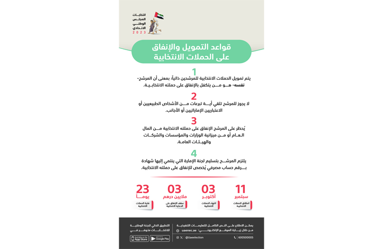 ودعت اللجنة الوطنية للانتخابات المرشحين إلى تعبئة استمارة طلب الموافقة على خطة الحملة الانتخابية للمرشح، عن طريق الموقع الإلكتروني uaenec.ae وذلك للحصول على ترخيص بشأن خطة حملاتهم الانتخابية، والتي تتضمن بيانات عن المرشح مقدم الطلب، والأنشطة والفعاليات التي يعتزم القيام بها (الدعاية التليفزيونية - الإعلانات الصحفية - الاجتماعات - إعلانات الشوارع)، وعدد المرات المزمع القيام بها، وتكلفتها المادية ومصادر تمويلها، إضافة إلى تعهده بالالتزام بضوابط الحملة الانتخابية التي وردت في التعليمات التنفيذية للانتخابات، وبالالتزام بخطة الدعاية الانتخابية التي تم الموافقة عليها، ثم التوجه إلى مقر لجنة الإمارة التي ينتمي إليها المرشح لتسليم خطة الحملة الانتخابية والحصول على موافقة لجنة الإمارة قبل افتتاح المقر الانتخابي للمرشح.وبحسب المادة (30) من التعليمات التنفيذية لانتخابات المجلس الوطني الاتحادي 2023؛ فإنه يحق لكل مرشح التعبير عن نفسه والقيام بأي نشاط يستهدف إقناع الناخبين باختياره، والدعاية لبرنامجه الانتخابي بحرية تامة، شريطة الالتزام بعدد من الضوابط والقواعد، هي: المحافظة على قيم ومبادئ المجتمع والتقيد بالنظم واللوائح والقرارات المعمول بها في هذا الشأن واحترام النظام العام، وعدم تضمين الحملة الانتخابية لأي استخدام للدين أو الشعارات الدينية بشكل مباشر أو غير مباشر أو أفكار تدعو إلى إثارة التعصب الديني أو الطائفي أو القبلي أو العرقي تجاه الغير، وعدم خداع الناخبين أو التدليس عليهم بأي وسيلة كانت، وعدم استخدام أسلوب التجريح أو التشهير أو التعدي باللفظ أو الإساءة إلى غيره من المرشحين بصورة مباشرة أو غير مباشرة، وعدم تضمين حملته الانتخابية وعوداً أو برامج تخرج عن صلاحيات عضو المجلس الوطني الاتحادي.
