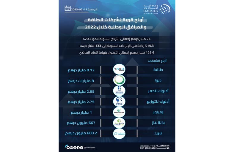 24 مليار درهم أرباح شركات الطاقة والمرافق المُدرجة خلال 2022.. وإيراداتها تنمو 19 %