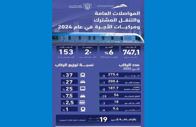 أما وسائل التنقل المشترك، فنقلت 56 مليون راكب العام الماضي بنسبة زيادة بلغت 28%، بينما نقلت مركبات الأجرة في دبي العام الماضي 200.6 مليون راكب بنسبة زيادة بلغت 1% مقارنةً بعام 2023 .